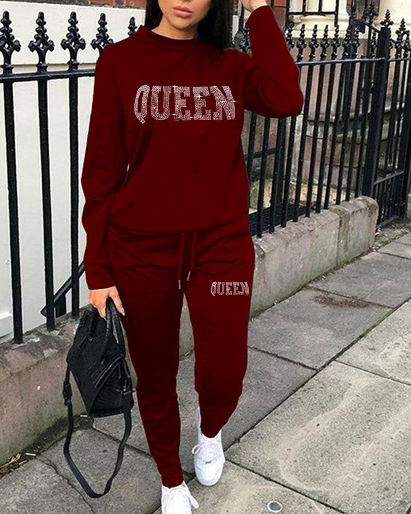 Plus Size Rhinestone Letter Pattern Sweatshirt & Drawstring Pants Set, Wine red