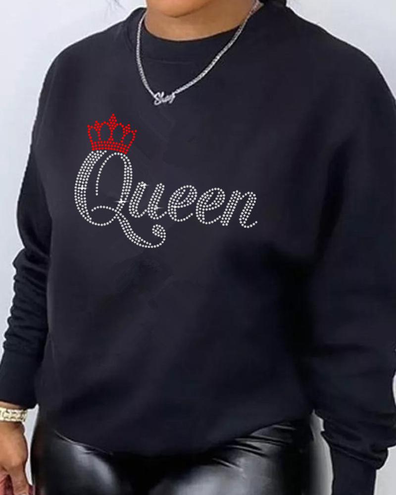 Plus Size Rhinestone Letter Queen Pattern Long Sleeve Sweatshirt, Black