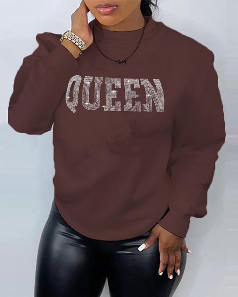 Plus Size Rhinestone Letter Queen Pattern O-Neck Sweatshirt, Brown
