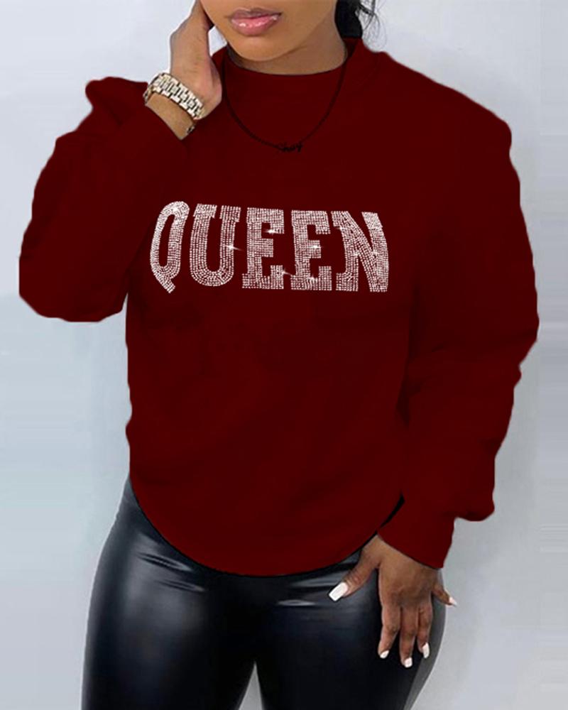 Plus Size Rhinestone Letter Queen Pattern O-Neck Sweatshirt, Wine red