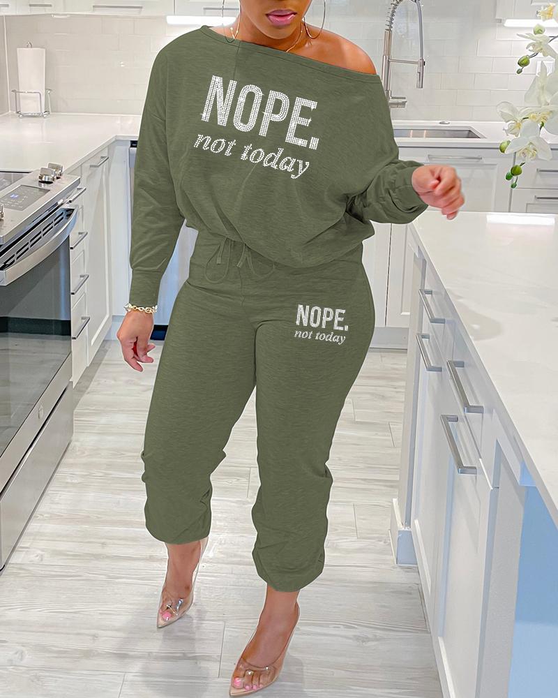Plus Size Rhinestone Nope Not Today Pattern Top & Pants Set, Green