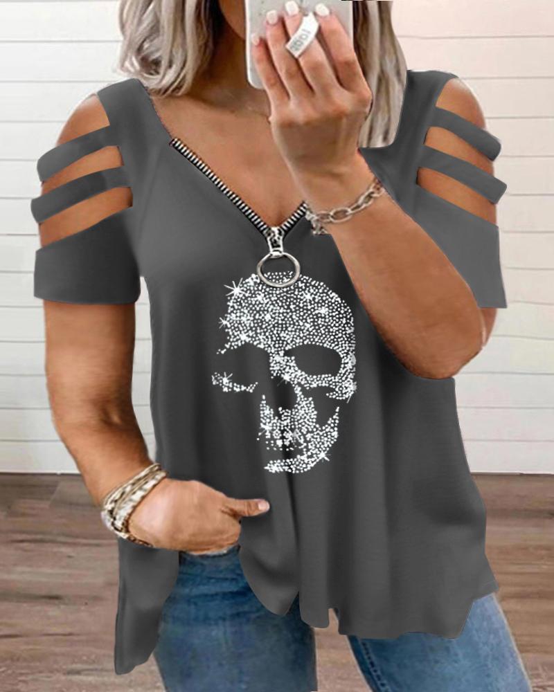 Plus Size Rhinestone Skull Pattern Cutout Zipper Design T-Shirt, Gray