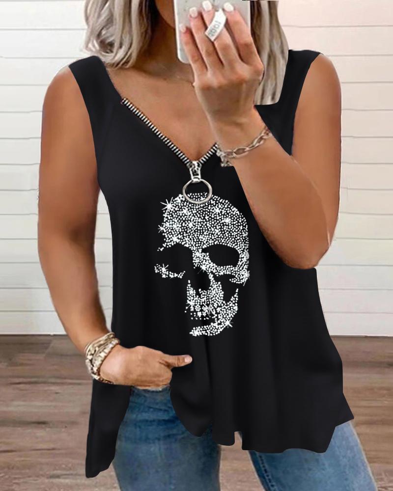 Plus Size Rhinestone Skull Pattern Zipper Design Tank Top, Black