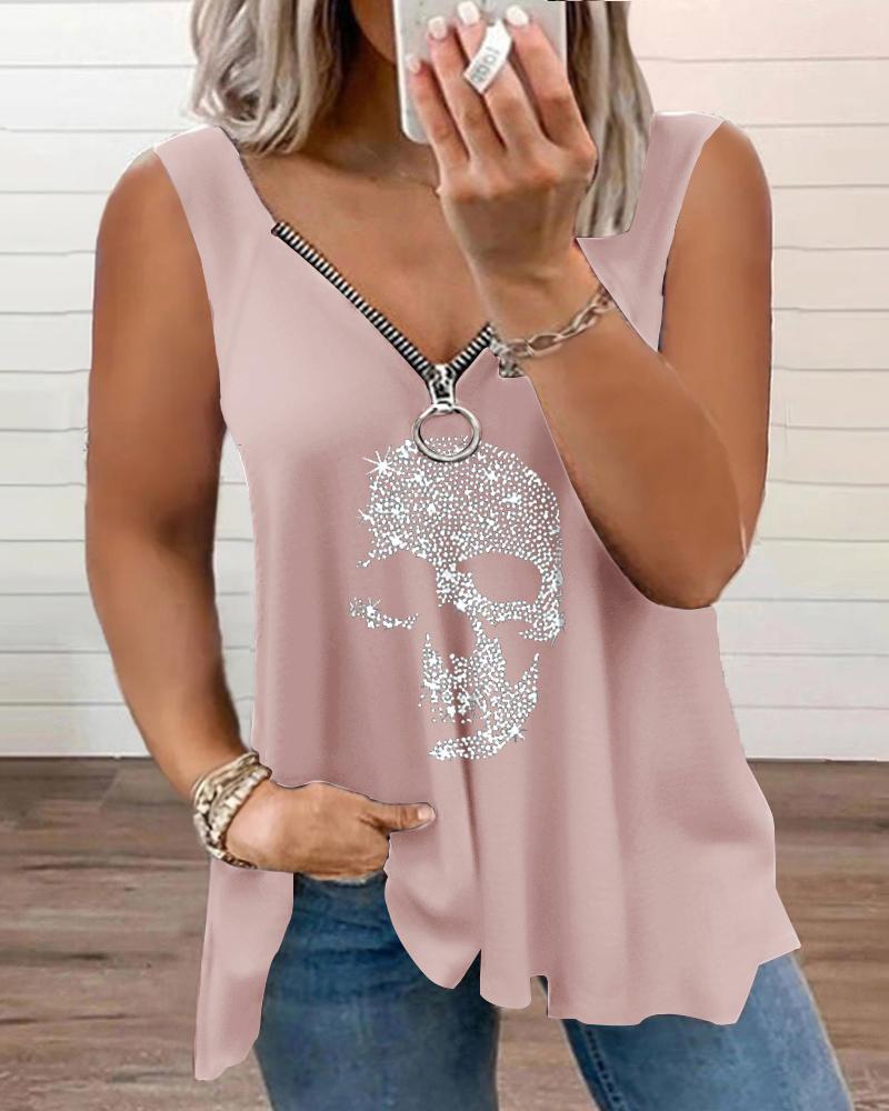 Plus Size Rhinestone Skull Pattern Zipper Design Tank Top, Pink
