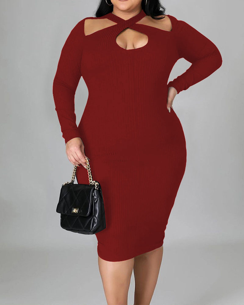 Plus Size Ribbed Cutout Long Sleeve Work Dress, Wine red