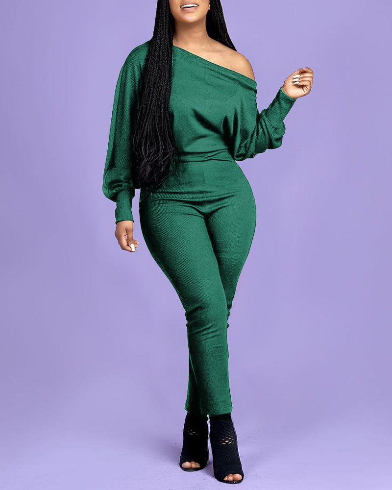 Plus Size Ribbed Lantern Sleeve Skinny Jumpsuit, Green