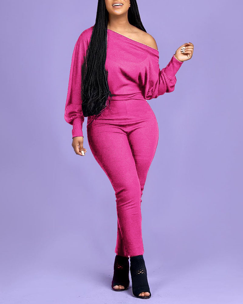 Plus Size Ribbed Lantern Sleeve Skinny Jumpsuit, Hot pink