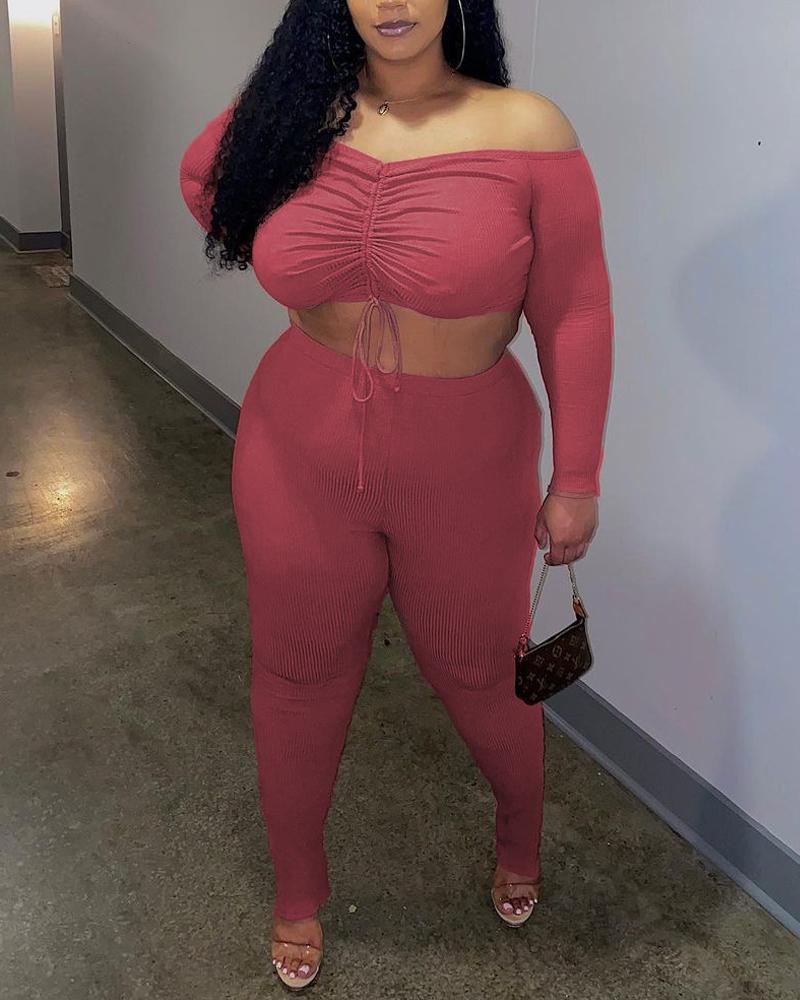 Plus Size Ribbed Off Shoulder Drawstring Crop Top & Pants Set, Pink