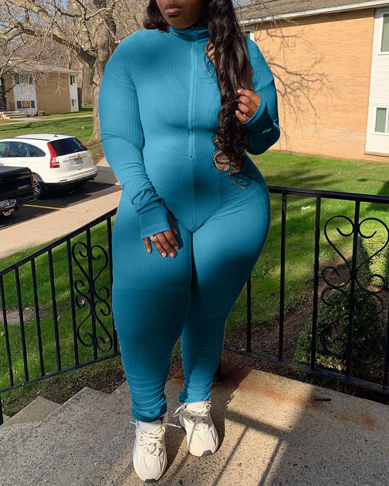 Plus Size Ribbed Plain Zipper Design Jumpsuit, Blue