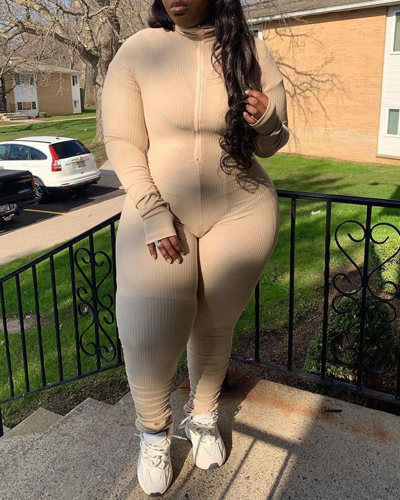Plus Size Ribbed Plain Zipper Design Jumpsuit, Khaki