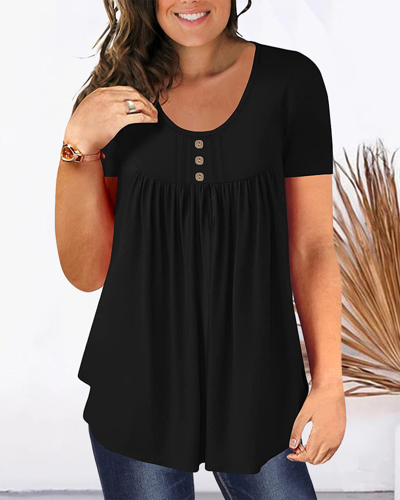 Plus Size Ruched Buttoned Short Sleeve Top, Black