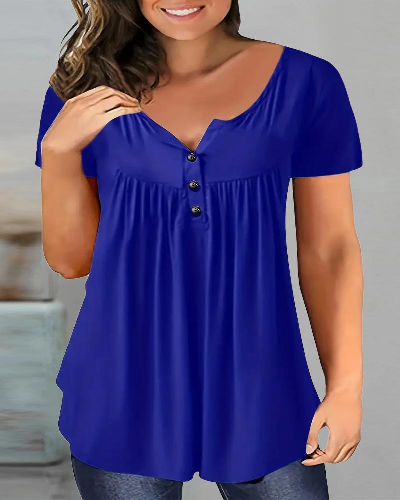 Plus Size Ruched Buttoned Short Sleeve Top, Blue