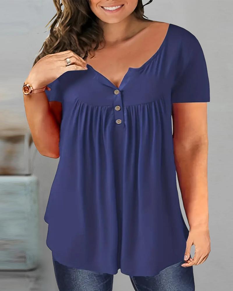 Plus Size Ruched Buttoned Short Sleeve Top, Purplish blue