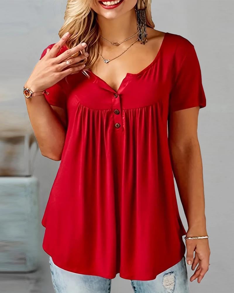 Plus Size Ruched Buttoned Short Sleeve Top, Red