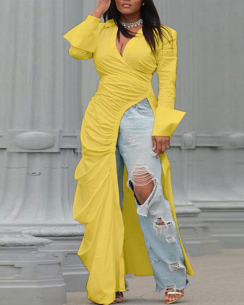 Plus Size Ruched High Slit Longline Top, Yellow