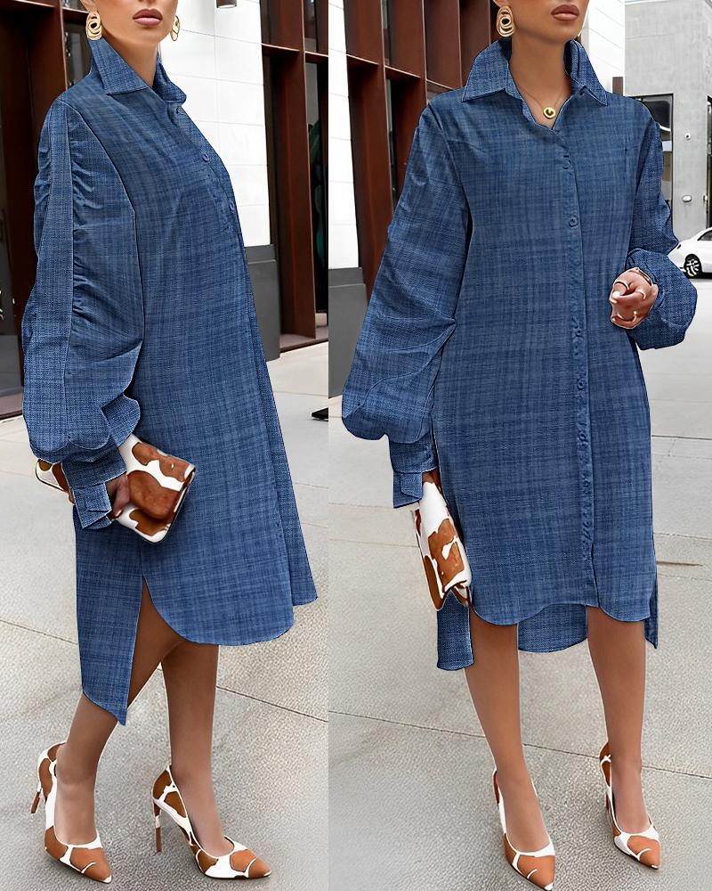 Plus Size Ruched Lantern Sleeve Buttoned Slit Shirt Dress, Blue