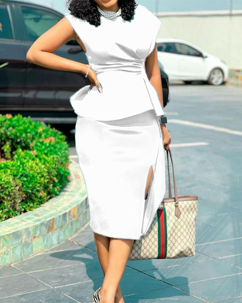 Plus Size Ruched Split Thigh Work Dress, White