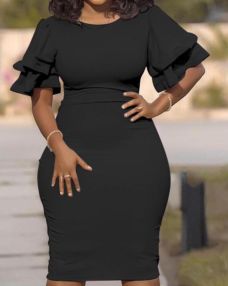 Plus Size Ruffle Bell Sleeve Work Bodycon Dress, Black