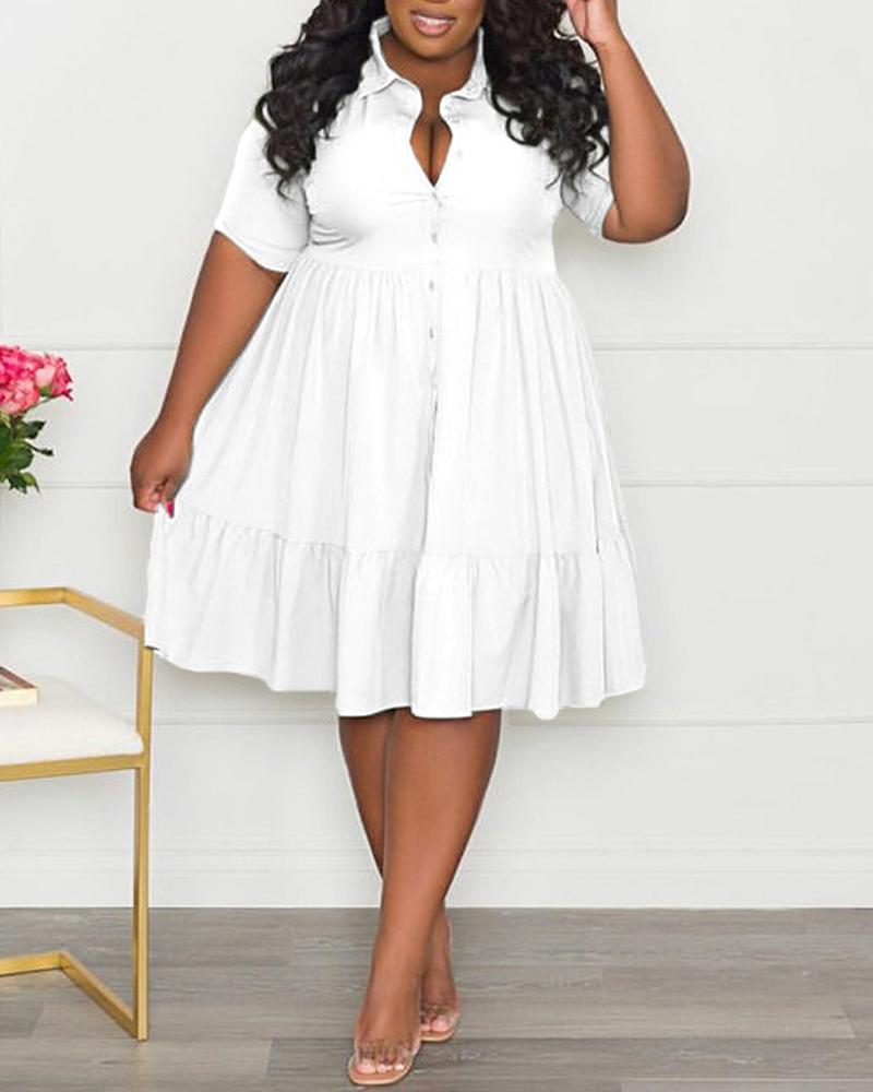 Plus Size Ruffle Hem Button Front Flowy Shirt Dress, White