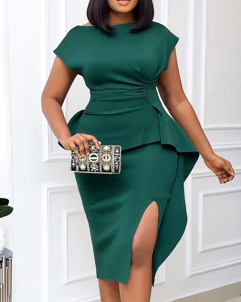 Plus Size Ruffle Hem Short Sleeve Slit Work Dress, Green