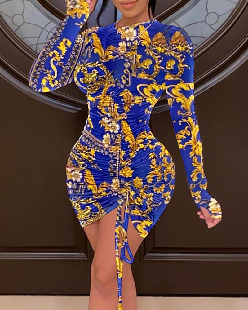 Plus Size Scarf Print Ruched Drawstring Bodycon Dress, Blue