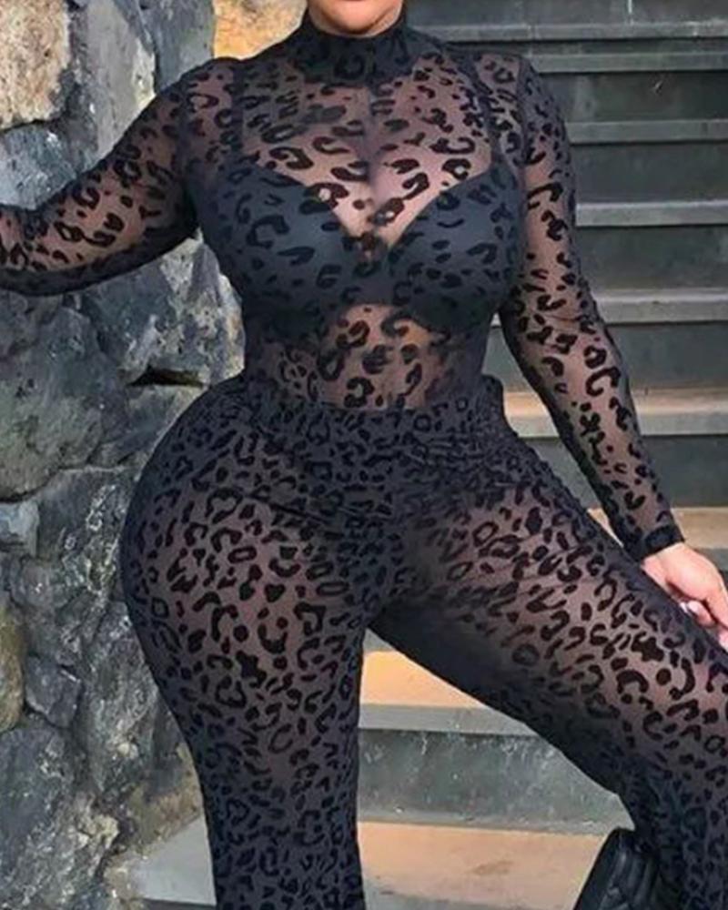 Plus Size Sheer Mesh Leopard Pattern Jumpsuit, Black