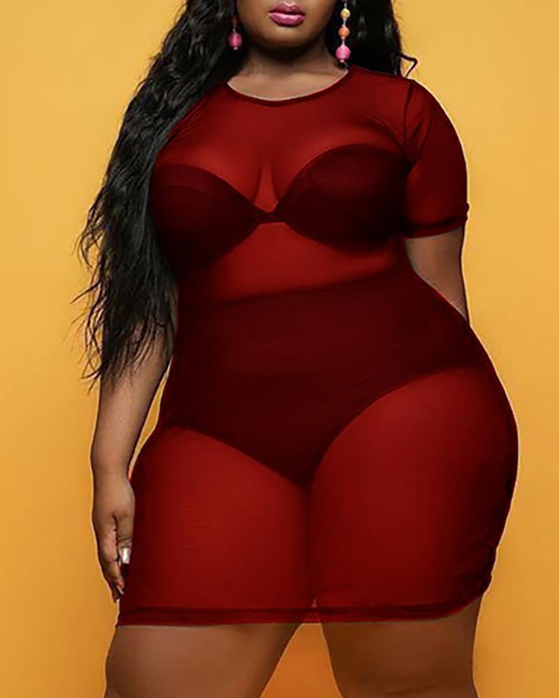 Plus Size Sheer Mesh Short Sleeve Bodycon Dress Without Lining, Red
