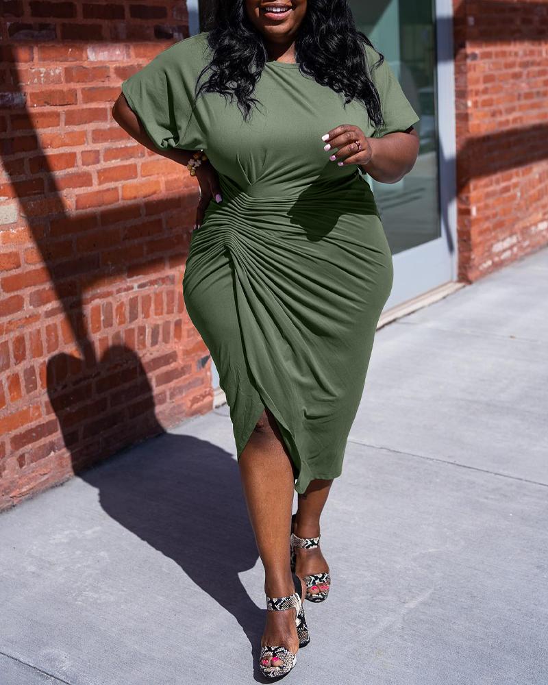 Plus Size Short Sleeve Ruched Slit Casual Dress, Green