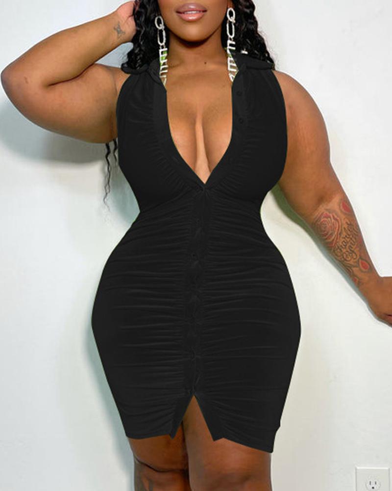 Plus Size Sleeveless Button Front Ruched Bodycon Dress, Black