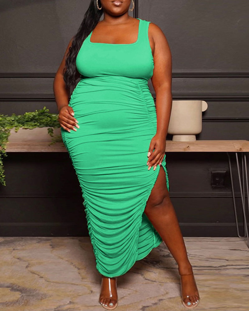 Plus Size Sleeveless Ruched Split Hem Bodycon Dress, Green
