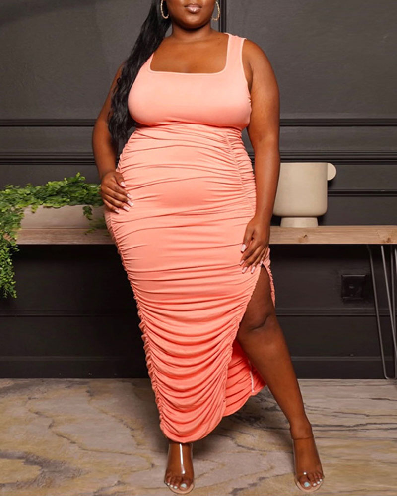 Plus Size Sleeveless Ruched Split Hem Bodycon Dress, Pink