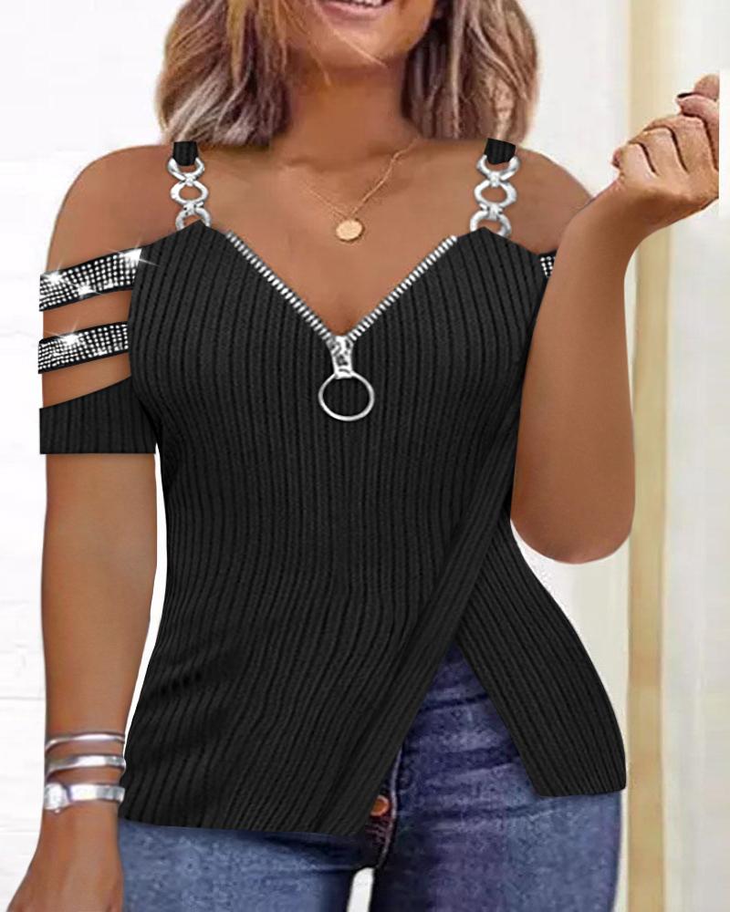 Plus Size Slit Cold Shoulder Ladder Cutout Rhinestone Top, Black