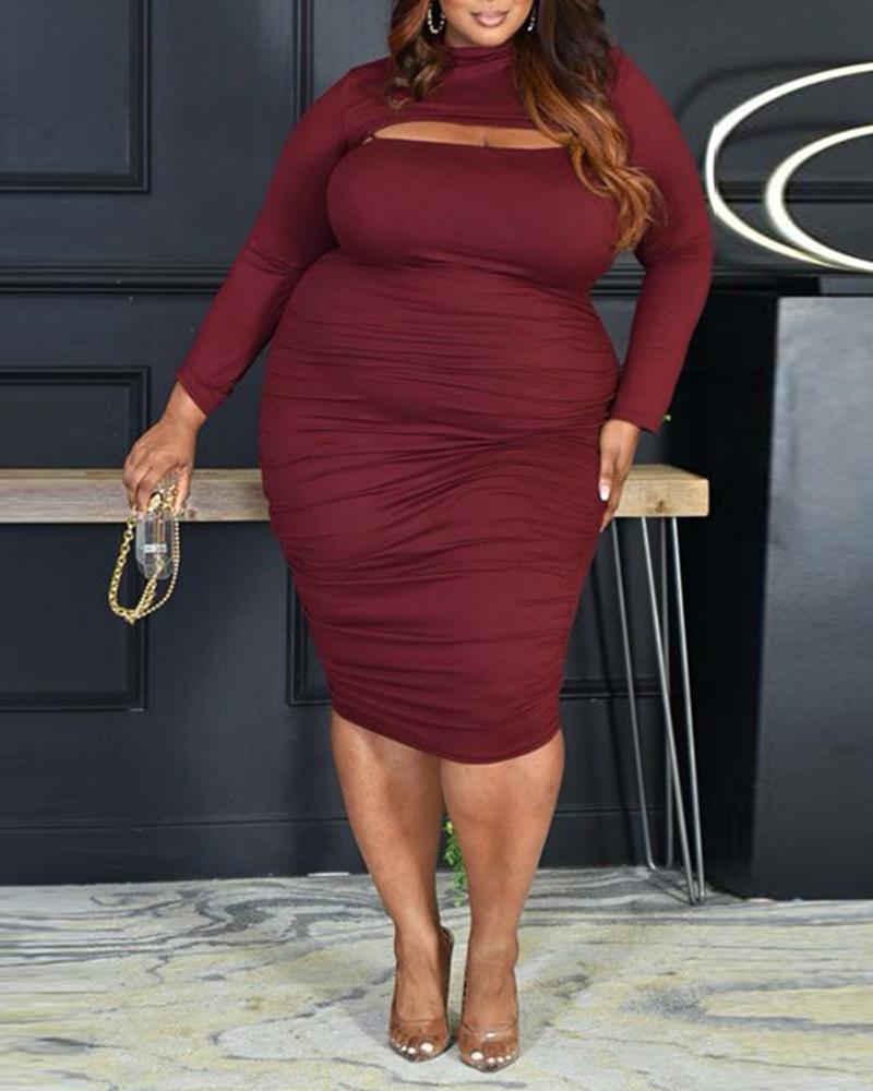 Plus Size Spaghetti Strap Ruched Bodycon Dress With Crop Top, Wine red