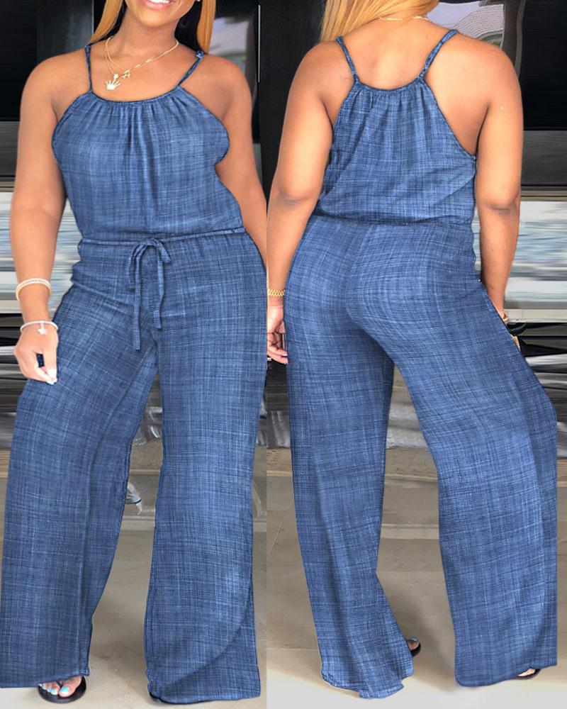 Plus Size Spaghetti Strap Stright Leg Drawstring Jumpsuit, Blue