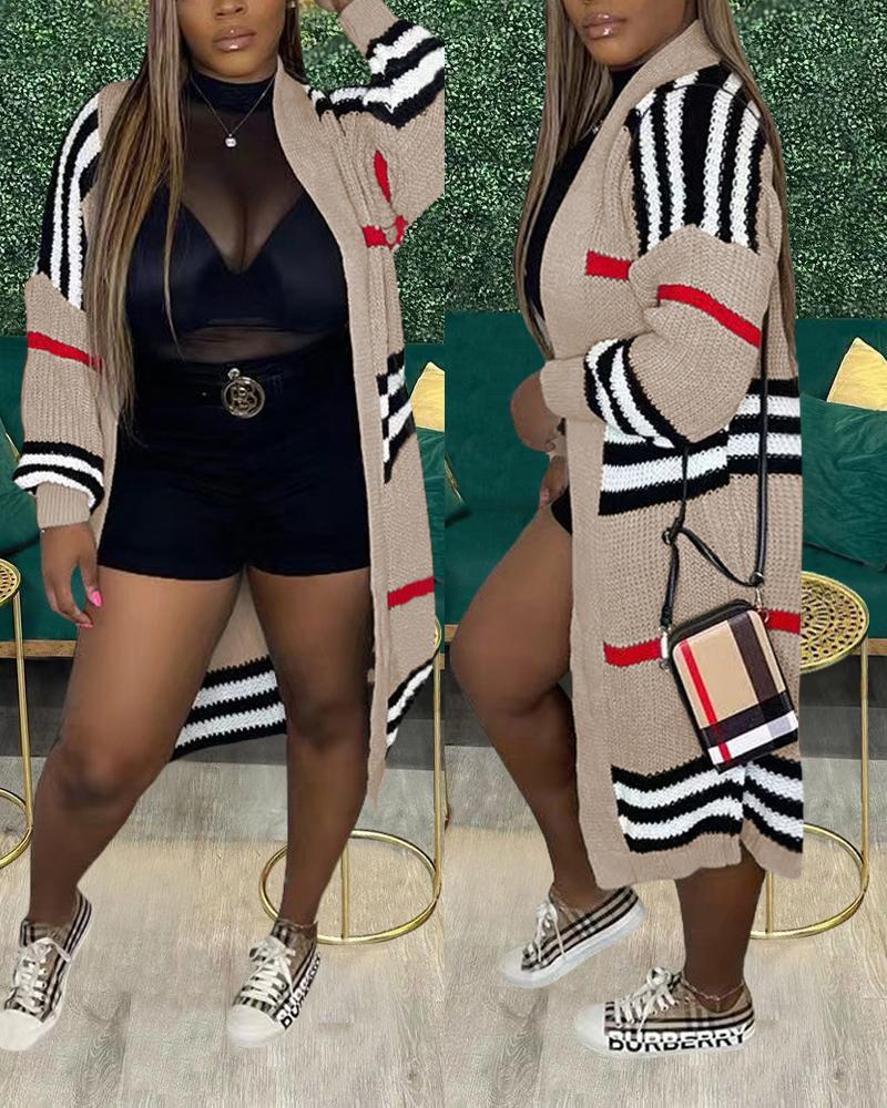 Plus Size Striped Chunky Knit Open Front Longline Cardigan, Apricot