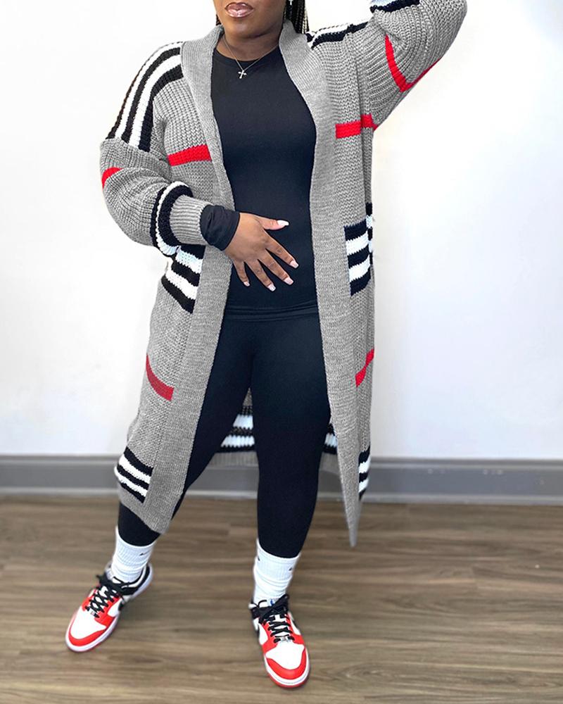 Plus Size Striped Open Front Longline Cardigan, Gray