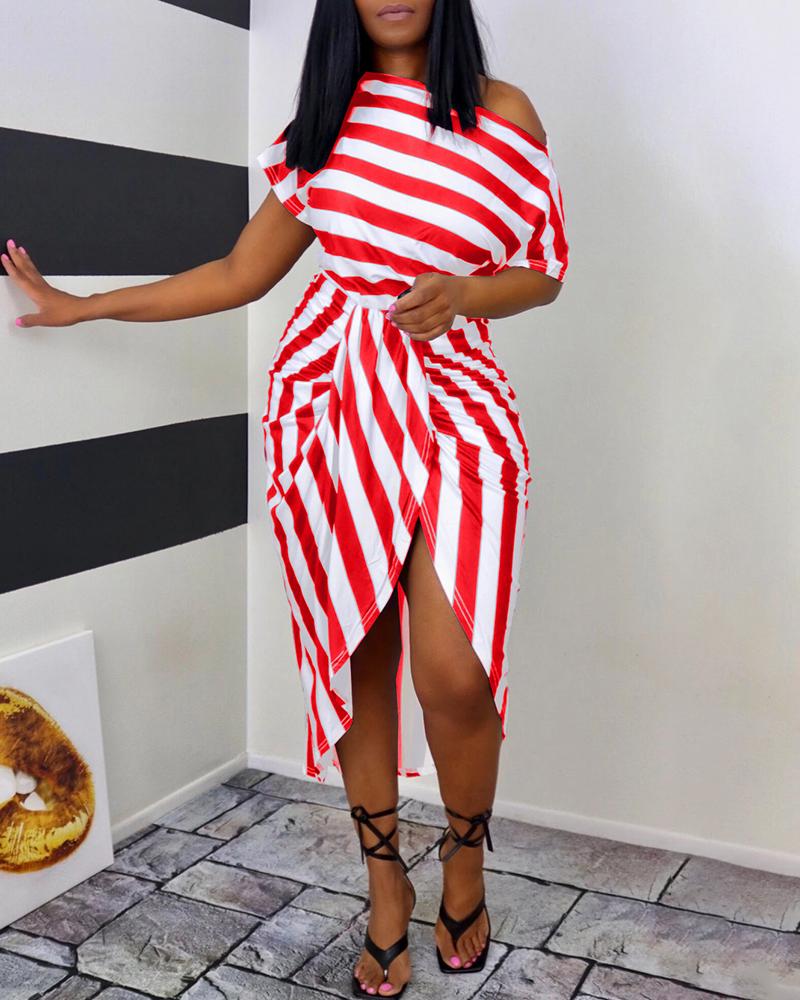 Plus Size Striped Print Ruched Split Work Dress, Red