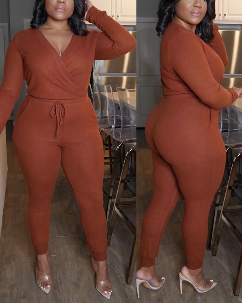 Plus Size Surplice Neck Long Sleeve Drawstring Jumpsuit, Red