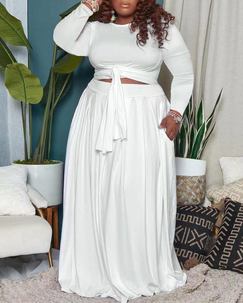 Plus Size Tied Detail Top & Pocket Design Skirt Set, White