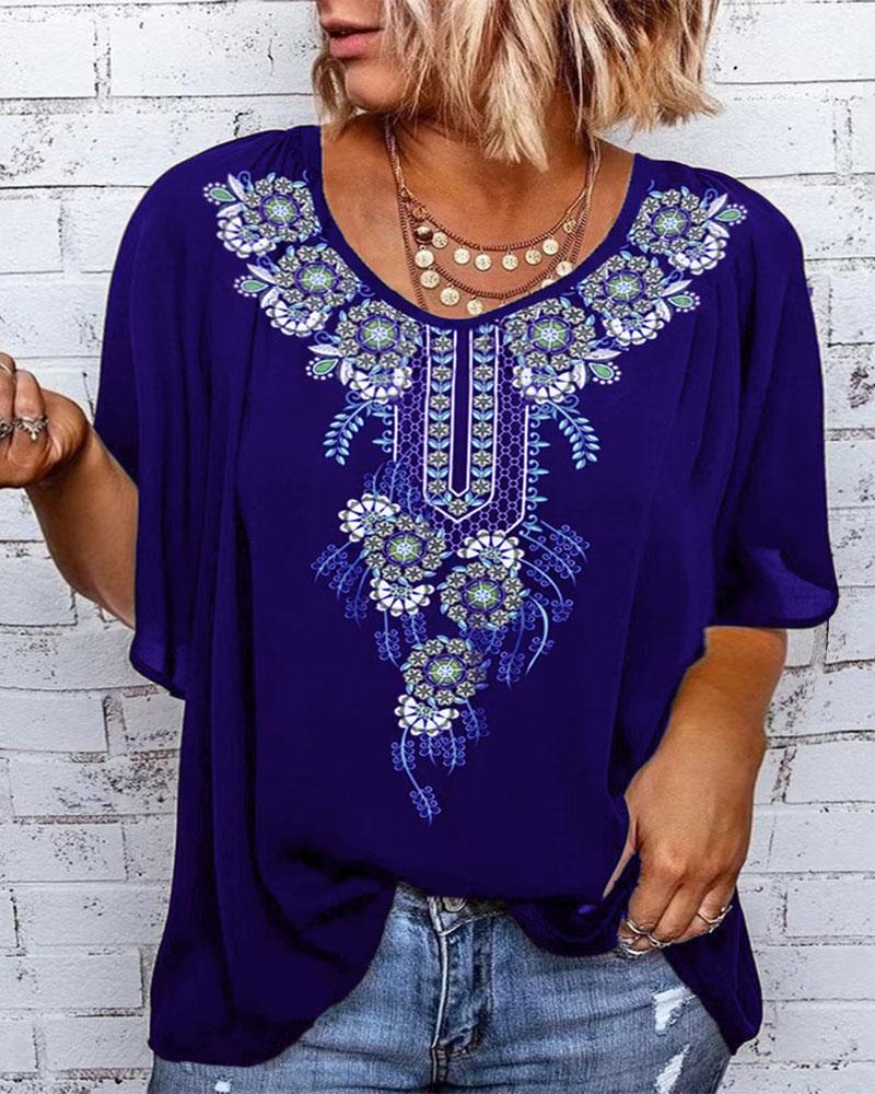 Plus Size Tribal Print Ruched Design Casual T-shirt, Blue