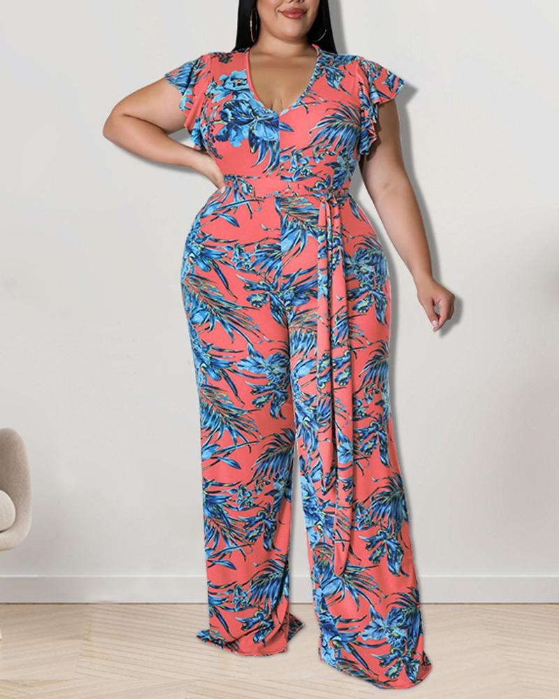 Plus Size Tropical Print Flutter Sleeve Belted Jumpsuit, Orange