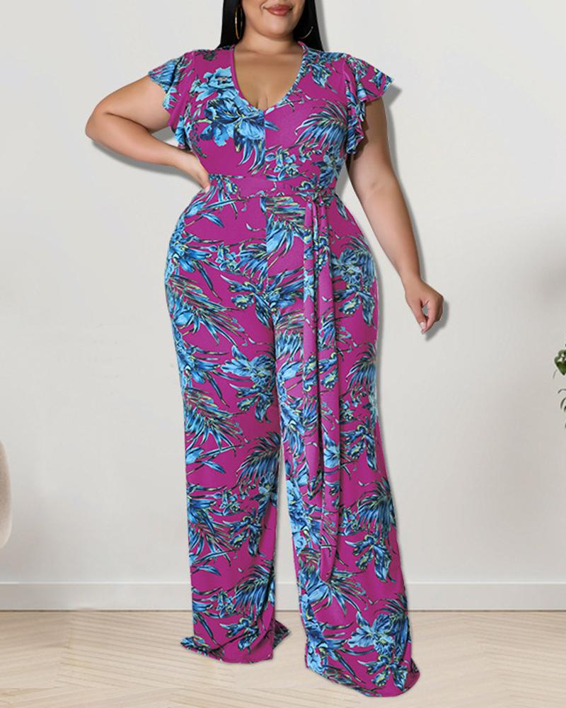 Plus Size Tropical Print Flutter Sleeve Belted Jumpsuit, Purple