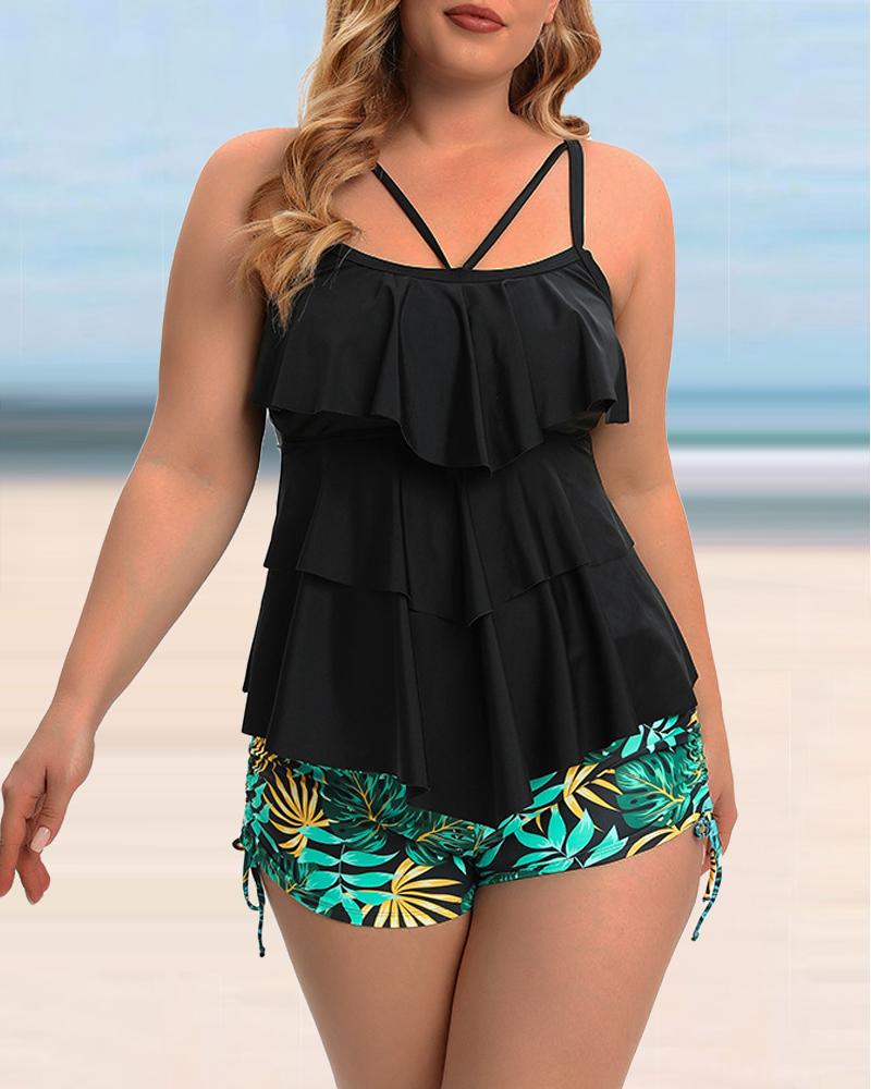 Plus Size Tropical Print Layered Ruffle Hem Tankini Set, Black