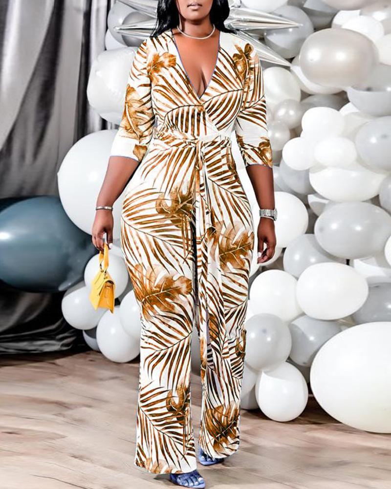 Plus Size Tropical Print Long Sleeve Jumpsuit, Yellow