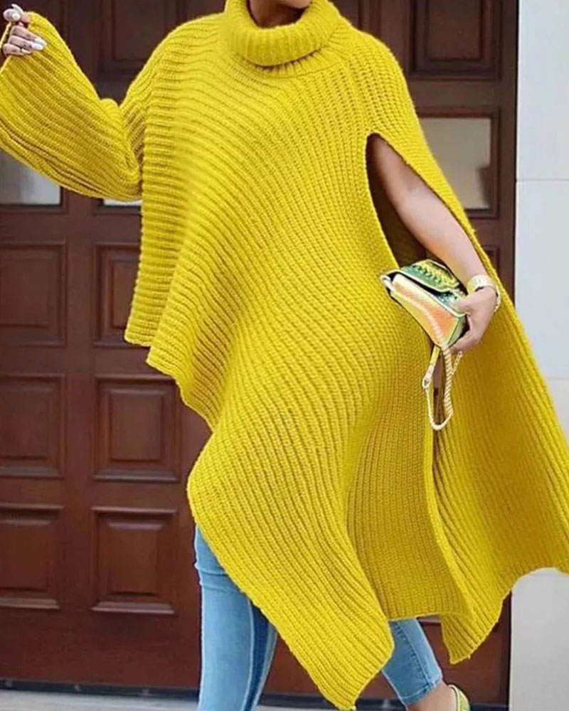 Plus Size Turtleneck Asymmetrical Hem Sweater, Yellow