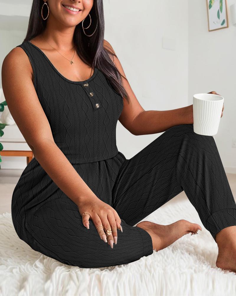 Plus Size U-Neck Drawstring Cable Textured Pajamas Set, Black