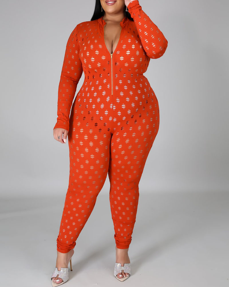 Plus Size Zip Front Hollow Out Skinny Jumpsuit, Orange