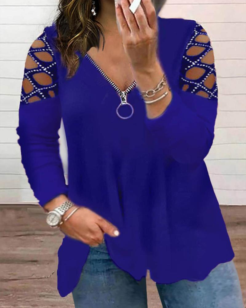 Plus Size Zip Front Rhinestone Cold Shoulder Top, Blue