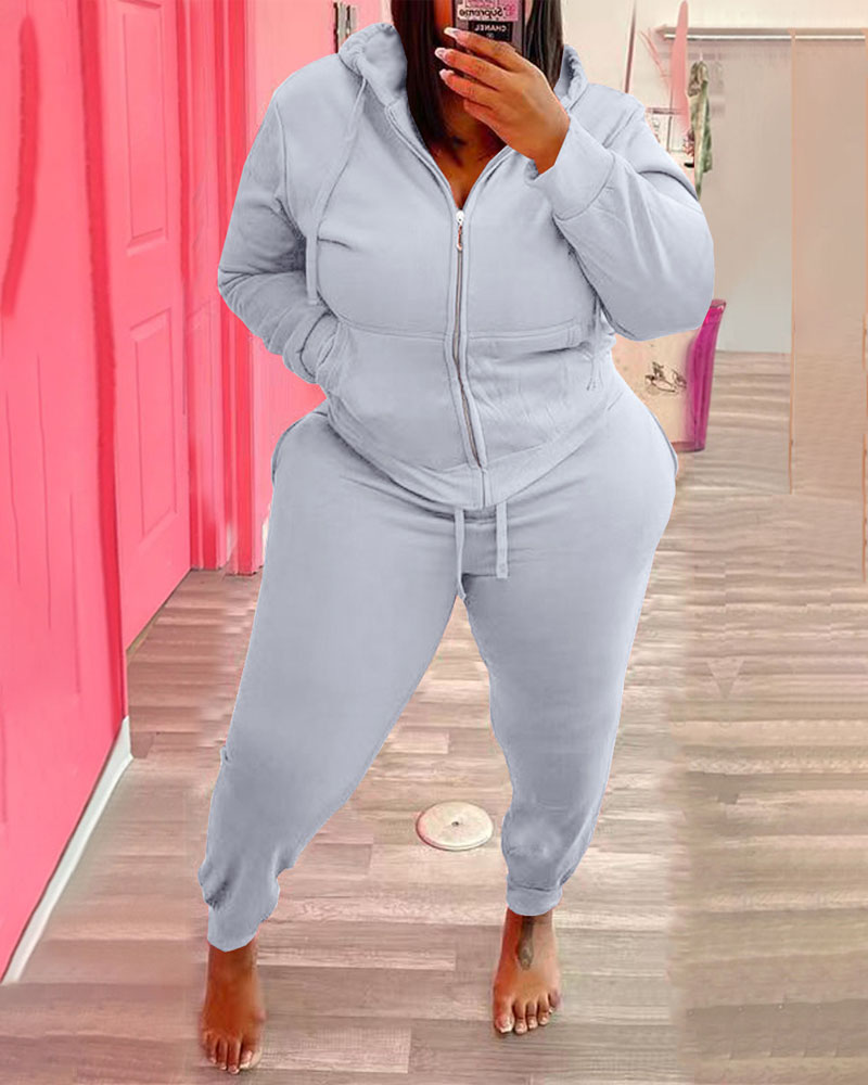 Plus Size Zip Up Hooded Top & Drawstring Pants Set, Gray