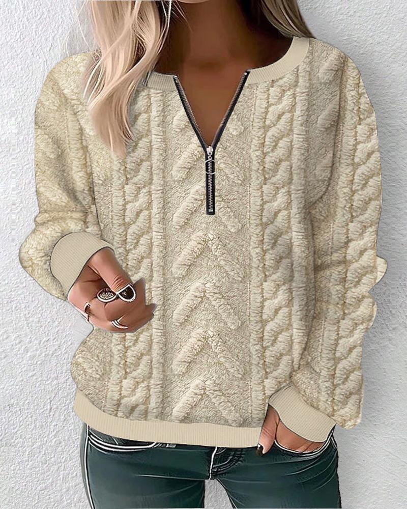 Plus Size Zipper Design Fuzzy Textured Sweatshirt, Apricot